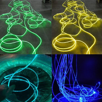 PMMA multi strands side glow fiber optic cable lighting. PMMA POF fibers with UV clear PE/PVC cladding, which can be used for outdoor lighting projects, like swimming pool or a light show with side glow effect. The whole product is safe and waterproof in a lighting decoration.